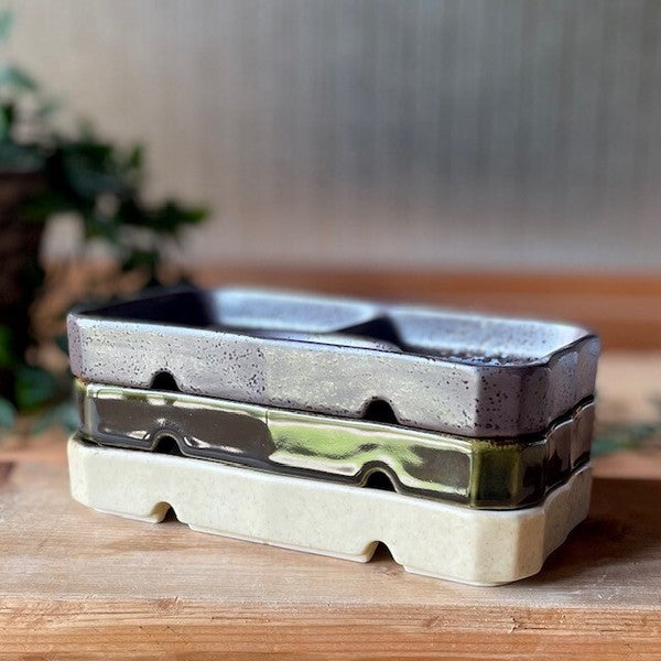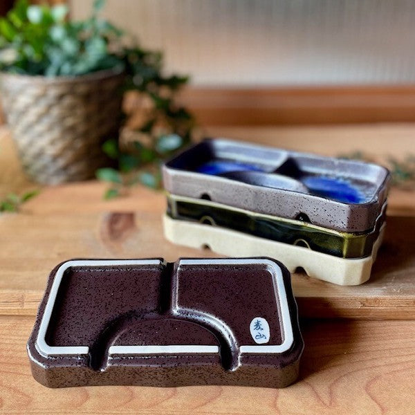【鐵仙花翡翠色/Tessenka Hiwa】 深咖啡色啞光釉面上撒有透明粒子,黃綠色(Hiwa)的防水釉手工噴塗,呈現和風沉穩綠意。 【鐵仙花瑠璃藍色/Tessenka Ruri】 深咖啡色啞光釉面上撒透明粒子,藍色(Ruri)防水釉手工噴塗,呈現和風沉穩藍意。