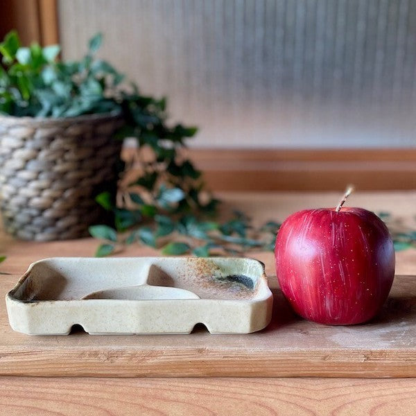 【黃綠茶邊/Beedoro】 盤口有茶色線條,與玻璃釉色融合,茶色邊緣微微暈染,營造出沉穩氣氛。 【伊賀織部/Iga Oribe】 盤面帶有如小石般的質感,「伊賀」風格以麥山窯手法呈現,再噴上綠色釉,增添織部風情。