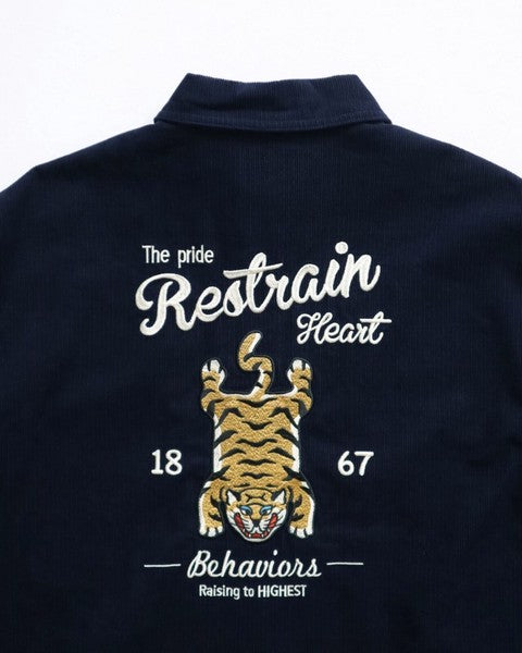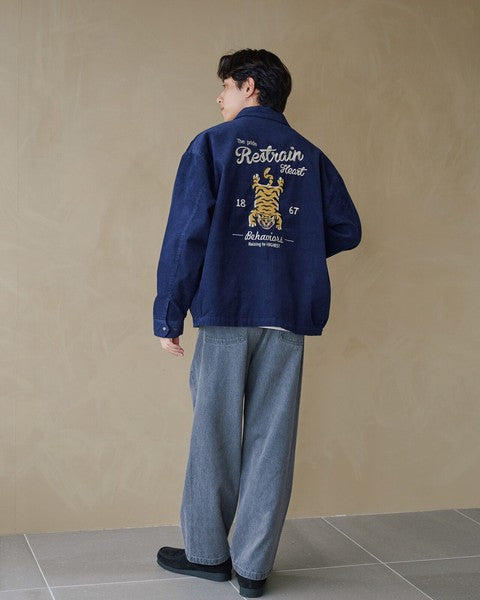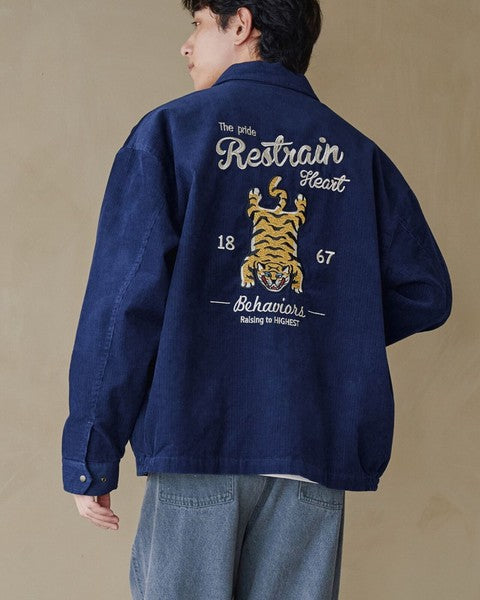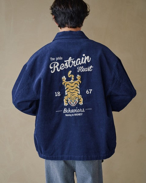 以 大面積虎刺繡 打造強烈存在感, 結合復古氛圍與街頭潮流的 燈芯絨外套。 背面大膽的 TIGER 刺繡,是整體造型的視覺焦點, 正面則以簡約 Logo 點綴,低調卻不失質感。