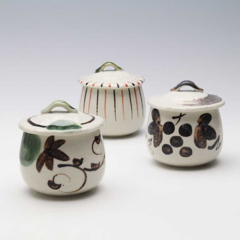■尖頭 渦點紋/志野葡萄/織部唐草 ・径7.8cm×高さ7.2cm 蓋含む:径9.2cm×高さ10cm