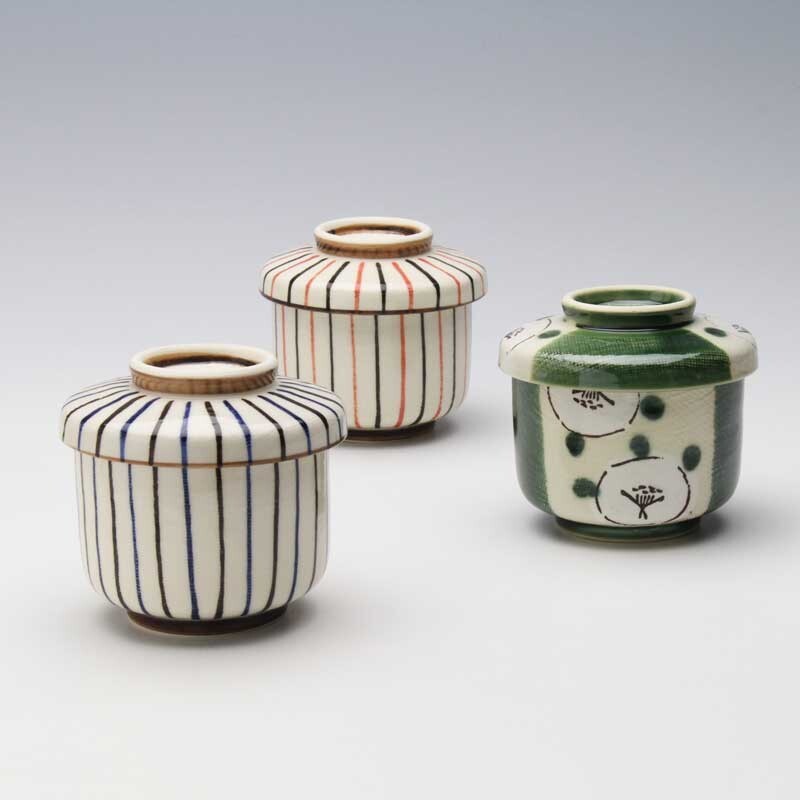 ■織部刷毛/藍色線條/彩色點點/點點漩渦/織部間取椿/十草(紅) ・径8.2cm×高さ6.7cm 含蓋:径9.2cm×高さ8.4cm