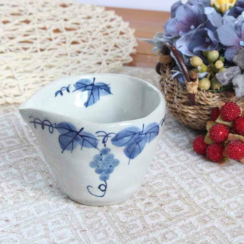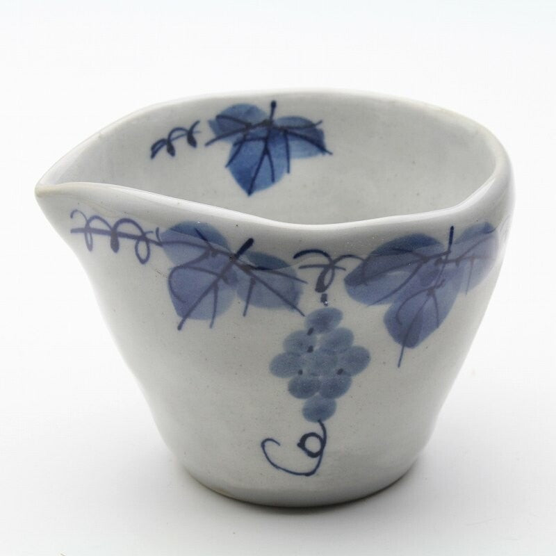 🥣 片口杯|粉引藍白葡萄紋 帶有倒口設計的片口杯,兼具實用與造型美感。可作為湯杯、醬汁杯或分裝用器,倒取流暢不滴漏。靛藍葡萄紋在白釉上自然展開,為餐桌增添日式職人氛圍,小巧卻很有存在感。