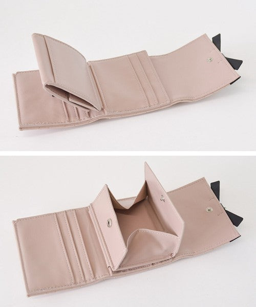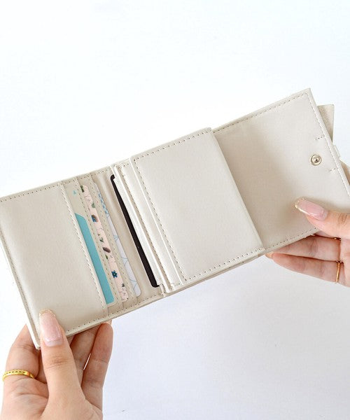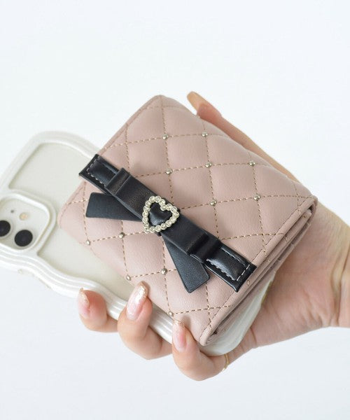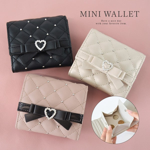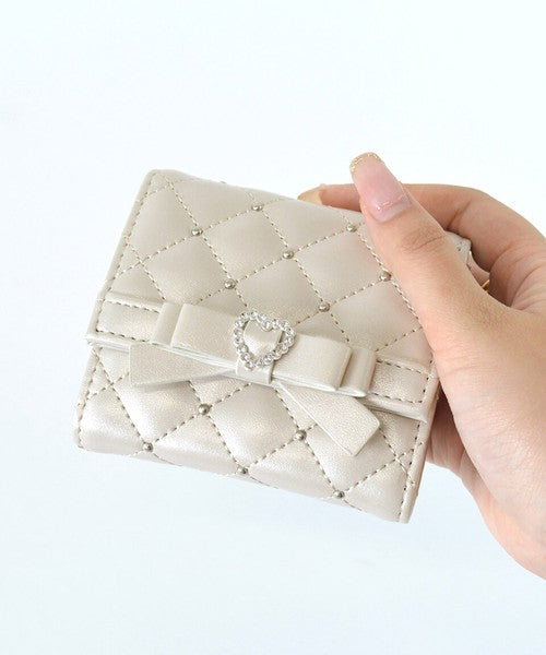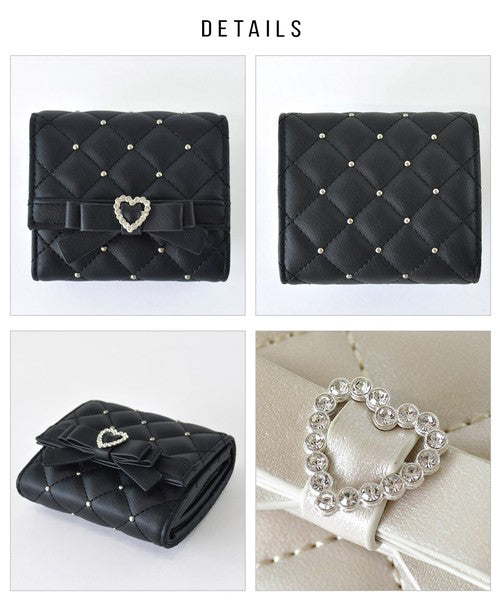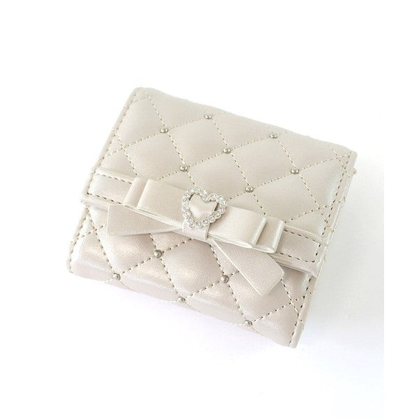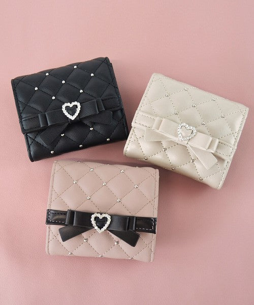 這款 三折短夾 採用菱格絎縫設計搭配心形扣飾與珍珠鉚釘,展現可愛又優雅的質感。 內部零錢包採盒形設計,方便查看與取用零錢;鈔票隔層可垂直或水平放置,支付更便利。